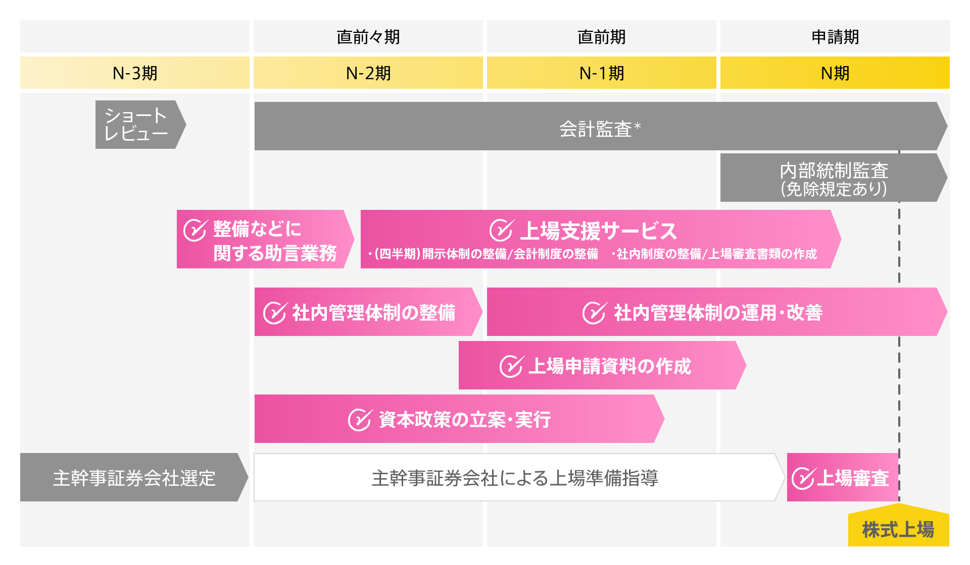 上場スケジュールにおける主幹事証券会社による指導および審査のタイミングは個別状況により異なります。